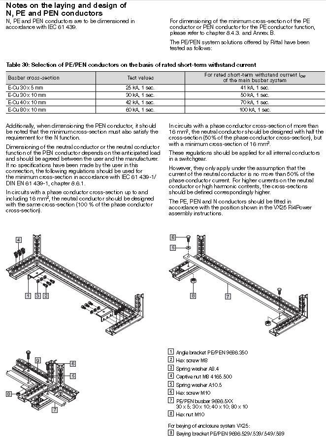 Por lo tanto, primeramente hemos de dimensionar correctamente la pletina de tierra (PE). Para este propósito la IEC61439 dispone de una formula para calcular la sección mínima de la pletina de PE (tierra) pero adicionalmente hay que dimensionarla acorde la resistencia soportada a cortocircuito del circuito de protección acorde el punto 10.5.3 de la norma. Siguiendo la filosofía inherente de Rittal, ya hemos realizado estos ensayos, y como resultado tenemos verificado la intensidad de cortocircuito que soportan diferentes tamaños de pletinas de tierra, así como una detallada técnica de montaje rápido que no requiere mecanizado de la pletina (Rittal’s style). Toda esta información se encuentra en la pag.115 del “Catálogo Técnico de VX25 Ri4Power”.